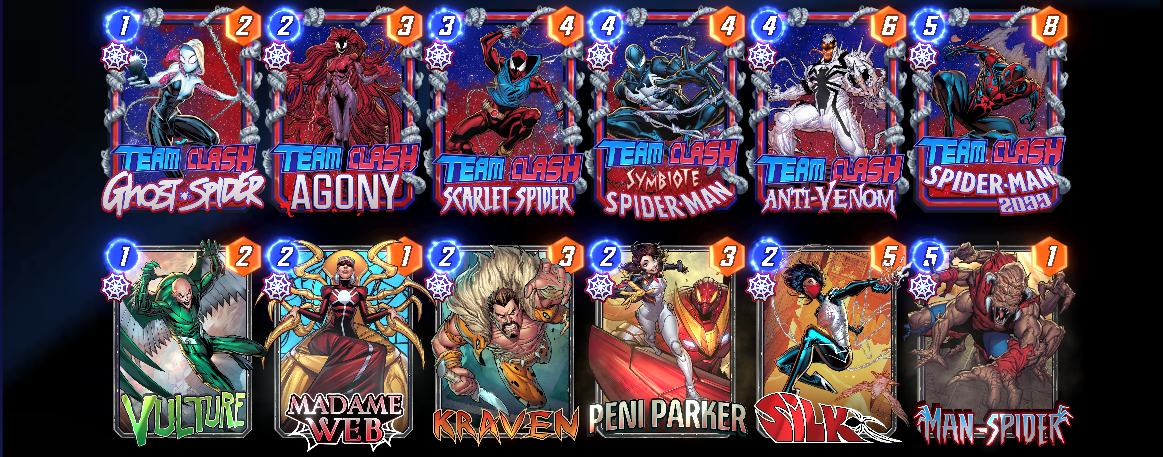 Team Clash Ghost Spider: On Reveal: The last card you played moves here. If it’s a Spider-Verse card, this gains +2 Power.